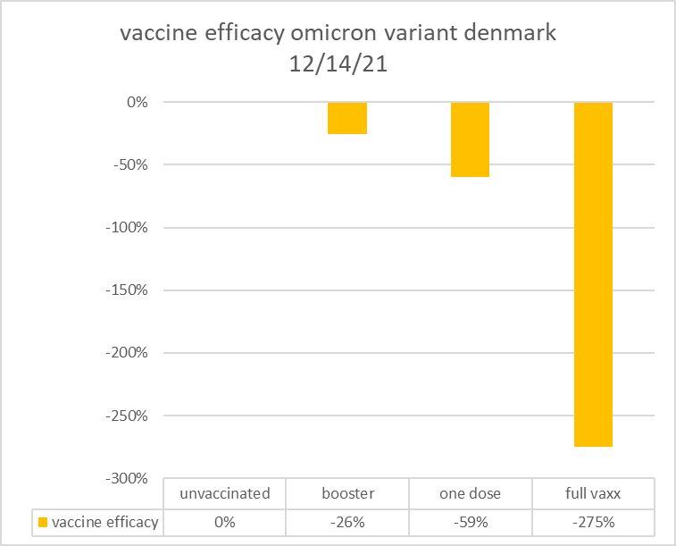 Tegyünk ezért egy villámgyors látogatást Dániába, ahol egy másik összegzett statisztika alapján az oltások oly csúfosan lebőgnek az omikron variánssal szemben, hogy a kétszer oltottak csaknem négyszer annyi, 275%-kal magasabb eséllyel zsebelhetik be kései karácsonyi ajándékként a maguk részére az omikron variánst. Hangyányit „jobban járnak” az emlékeztető oltást felvevők, kiknek fertőződési kockázata „mindössze” 26%-kal magasabb egy oltatlanhoz képest.